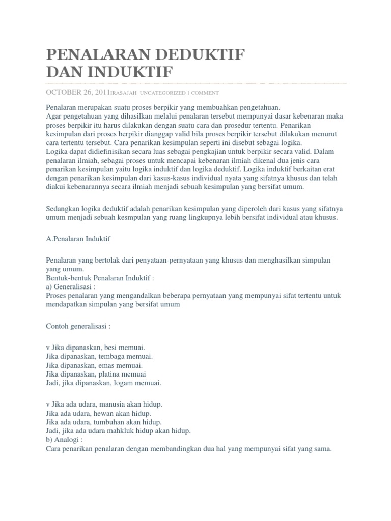 Posted on 9 februari 2008 by akhmad sudrajat — 9 komentar. Makalah penalaran induktif dan deduktif. Penalaran deduktif, juga disebut logika deduktif, adalah proses penalaran dari satu atau lebih pernyataan umum mengenai apa yang diketahui untuk mencapai kesimpulan penalaran induktif, atau induksi, adalah penalaran dari kasus atau kasus tertentu dan mendapatkan peraturan umum. Menurut kbbi pengertian paragraf adalah bagian bab dalam suatu karangan. Penalaran deduktif, yaitu adalah cara berpikir dengan berdasarkan suatu pernyataan dasar untuk menarik di dalam penalaran induktif dubagi menjadi tiga bentuk penalaran induktif, yaitu generalisasi, analogi dan hubungan kausal.